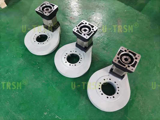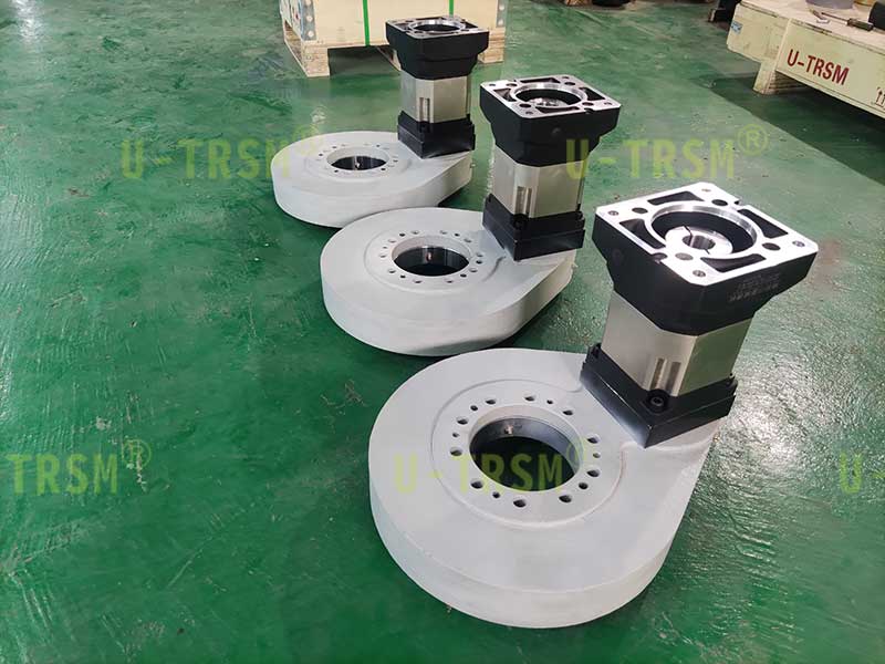 客户需要我们配套合适的减速机,根据使用工况,我们选择了输出扭矩和减速比都适合的行星减速机,并且对减速机和回转驱动做了适配设计。发货前我们为客户安装好行星减速机,客户收到货,直接连接伺服电机回转单元就可以旋转使用了,非常的方便。