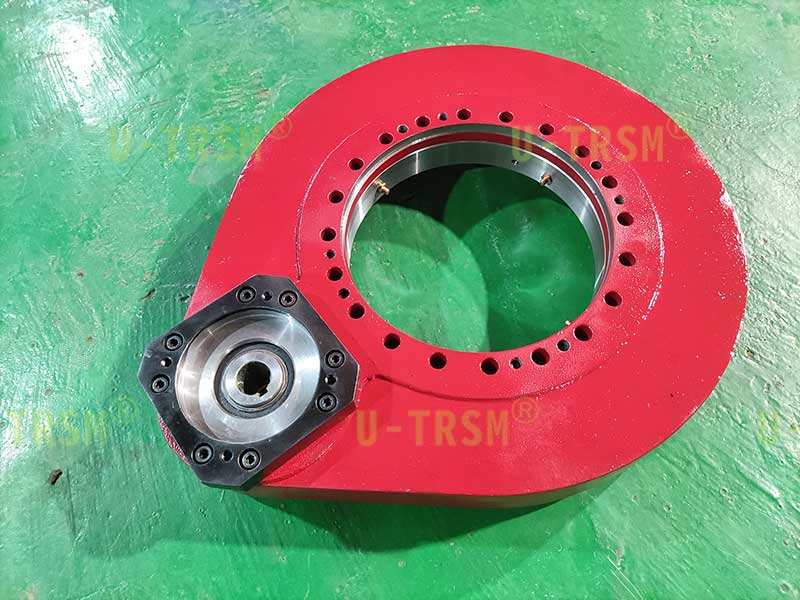 S-I-O-0311齿轮式回转驱动是一款应用在机床设备上的精密型产品。跟一般产品不同的是,这款回转驱动装置在机床设备上需要反向安装,也就是外圈转动的轴承圈向下带动客户的工装对工件进行旋转,并且需要很高的回转精度。