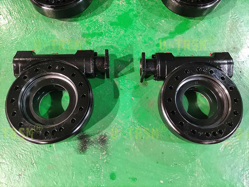 SE9 蜗轮蜗杆回转驱动应用在工业自动化领域,一个左输入驱动和一个右输入驱动相对竖直安装使用,安装后电机都朝设备外部。