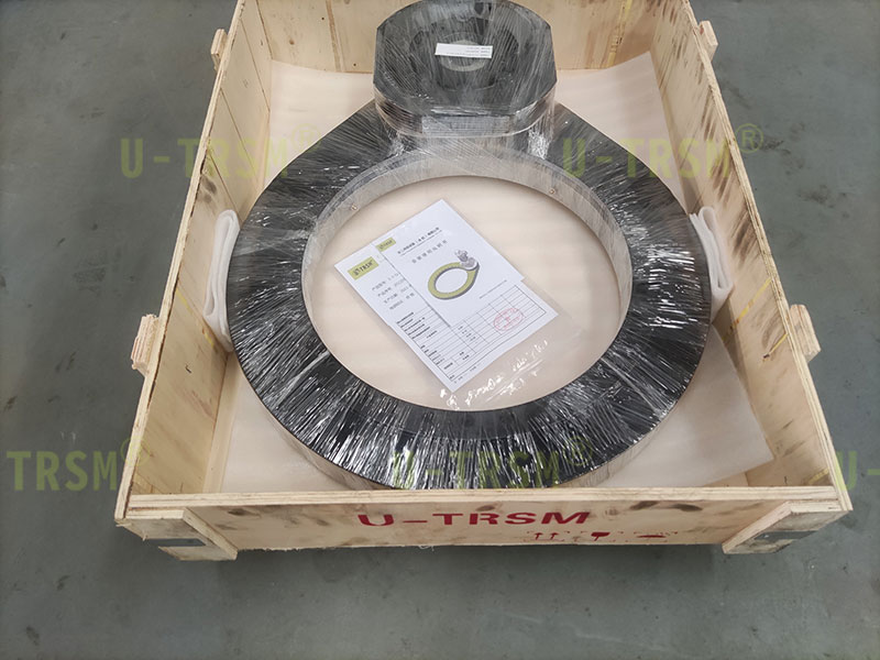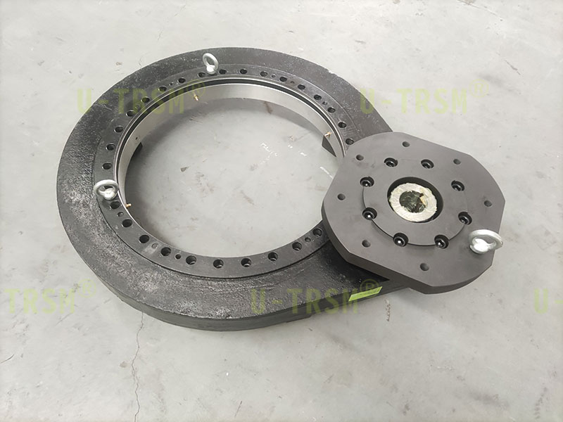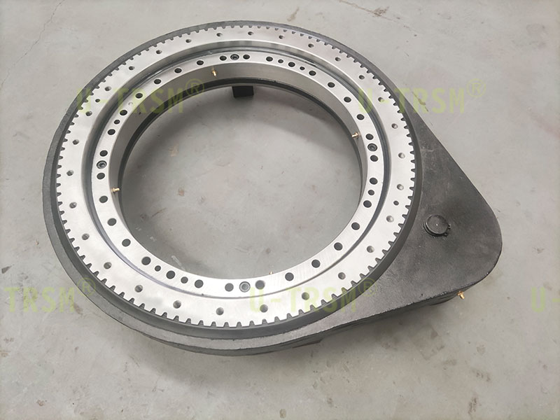 为了让设备转动更平稳回转驱动还是采用零游隙,为了精准控制角度,齿圈和齿轮淬火后磨齿加工,淬火提高齿面硬度,增加扭矩,减少磨损,精度保持更久,磨齿可以保证良好精度。回转驱动的输入端客户选择了蜗轮减速机对回转驱动提供动力,利用涡轮减速机具有机械自锁这一特点提高设备整体的安全性。