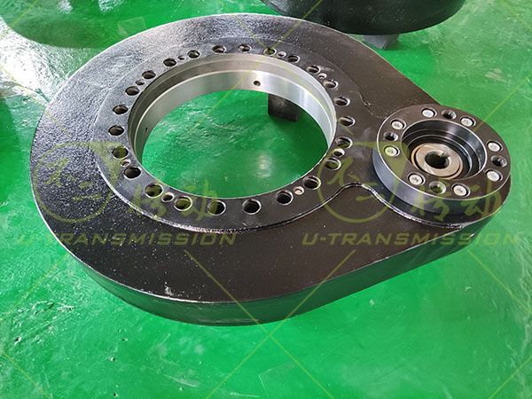 根据上述工况回转支承按照大倾覆力矩设计,采用小游隙高精度设计,确保高转速下回转驱动旋转平稳,齿采用表面感应淬火,保证大的输出扭矩及耐磨性能,齿芯部柔软,具有很好的耐冲击性,适合大惯量,大冲击载荷。壳体采用球墨铸铁QT450-10铸造而成,机械性能优良,稳定性高,耐磨抗震,壳体表面喷塑处理,防锈美观,喷塑前进行磷化处理,提高防锈能力及喷塑的附着力。输入端法兰按照客户马达输出端尺寸设计制造,客户可以直接连接马达,给客户提供很大的便利,减少连接部件,增加稳定性,节约空间,缩小整机体积,降低陈本。